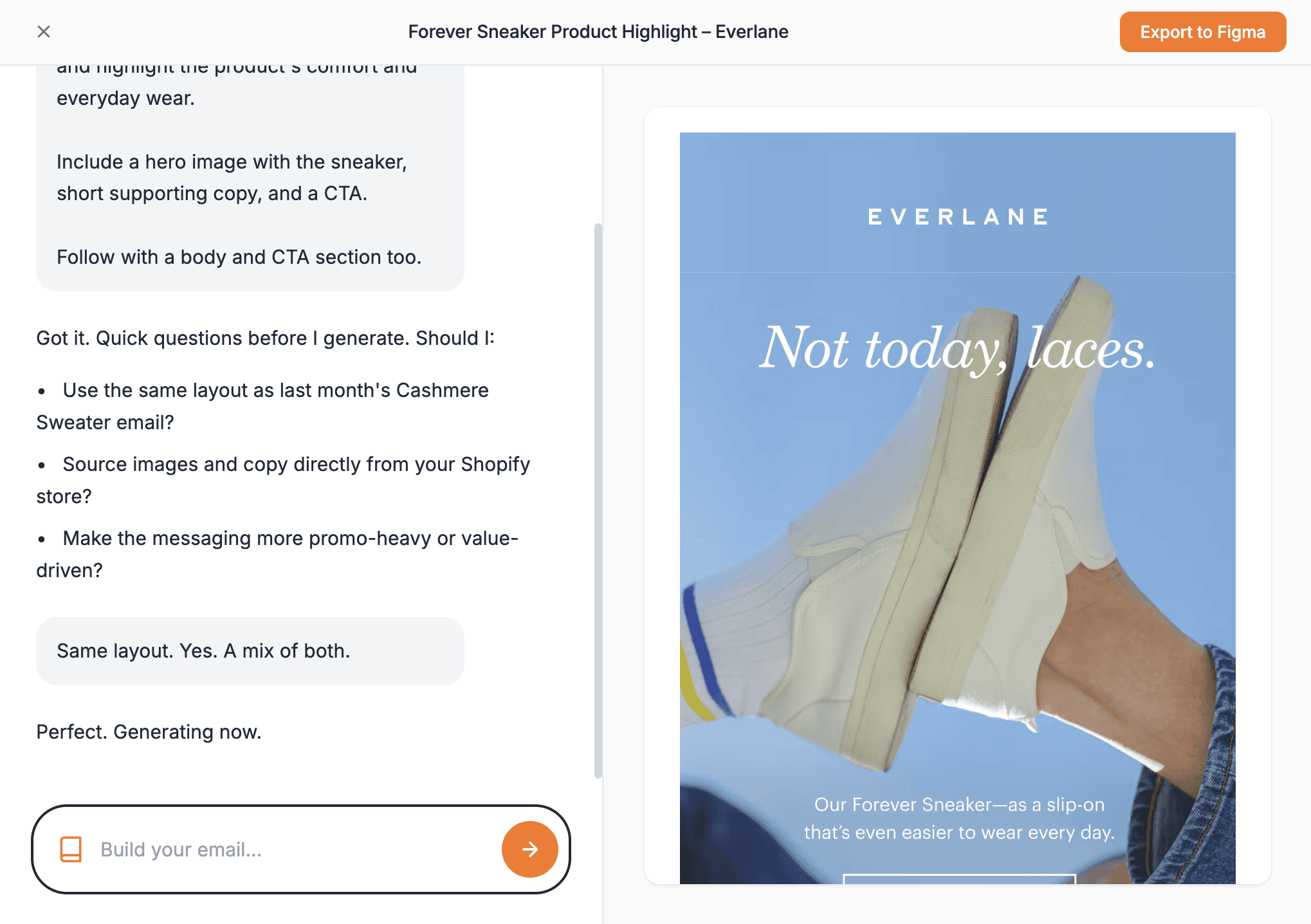 Built specifically for ecommerce email design. Understands your workflow, your clients, and what makes emails convert.